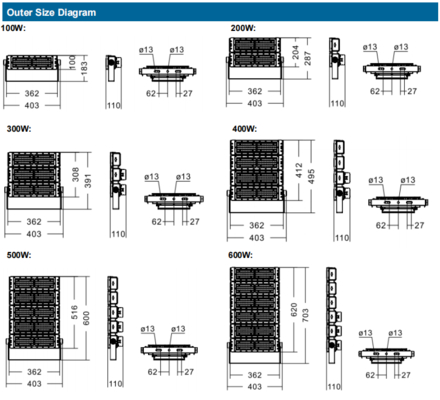 | Zastosowania | Oświetlenie krajobrazu, tunele, boiska piłkarskie, oświetlenie ścian zewnętrznych |
